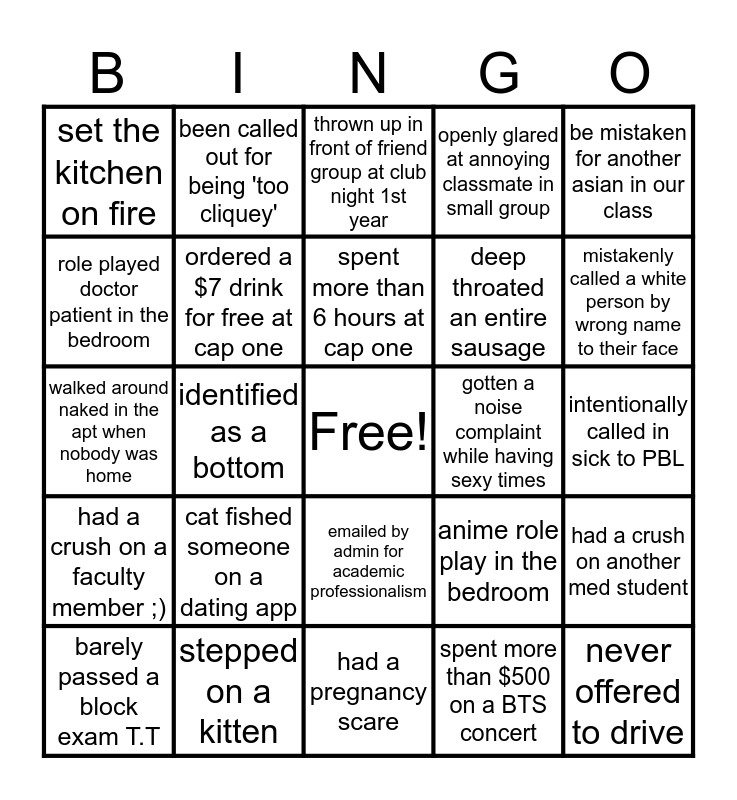 This bingo card has a free space and 24 words: cat fished someone on a dating app, stepped on a kitten, spent more than 6 hours at cap one, barely passed a block exam T.T, be mistaken for another asian in our class, set the kitchen on fire, role played doctor patient in the bedroom, been called out for being 'too cliquey', gotten a noise complaint while having sexy times, emailed by admin for academic professionalism, deep throated an entire sausage, walked around naked in the apt when nobody was home, anime role play in the bedroom, had a crush on another med student, ordered a $7 drink for free at cap one, spent more than $500 on a BTS concert, intentionally called in sick to PBL, thrown up in front of friend group at club night 1st year, mistakenly called a white person by wrong name to their face, identified as a bottom, never offered to drive, had a crush on a faculty member ;), openly glared at annoying classmate in small group and had a pregnancy scare.