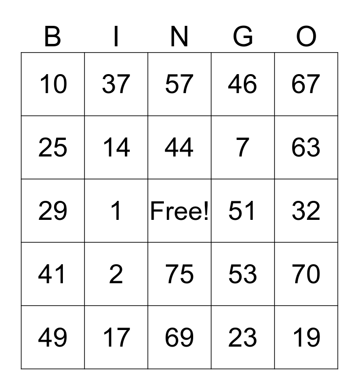 This bingo card has a free space and 24 words: 2, 17, 44, 49, 67, 10, 25, 37, 51, 75, 7, 29, 53, 70, 14, 23, 32, 57, 63, 1, 19, 41, 46 and 69.