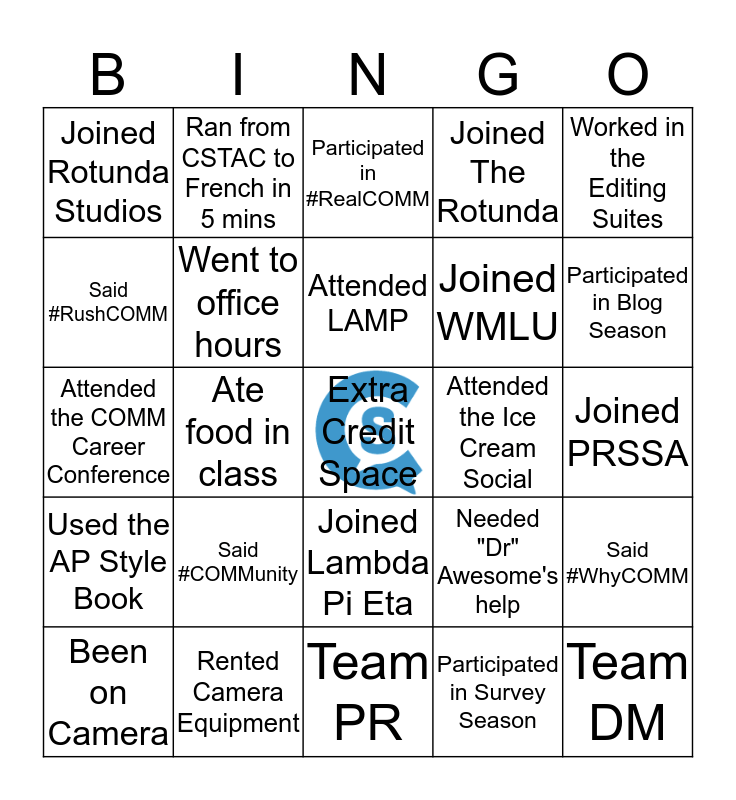 This bingo card has a free space and 24 words: Said #COMMunity, Rented Camera Equipment, Attended LAMP, Been on Camera, Worked in the Editing Suites, Joined Rotunda Studios, Said #RushCOMM, Ran from CSTAC to French in 5 mins, Attended the Ice Cream Social, Joined Lambda Pi Eta, Joined WMLU, Attended the COMM Career Conference, Needed "Dr" Awesome's help, Said #WhyCOMM, Went to office hours, Participated in Survey Season, Joined PRSSA, Participated in #RealCOMM, Participated in Blog Season, Ate food in class, Team DM, Used the AP Style Book, Joined The Rotunda and Team PR.