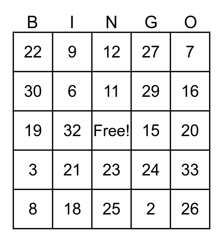This bingo card has a free space and 34 words: 1, 2, 4, 5, 3, 6, 7, 8, 9, 10, 11, 12, 13, 14, 15, 16, 18, 19, 21, 24, 23, 17, 22, 20, 25, 26, 27, 28, 29, 30, 31, 32, 33 and 34.