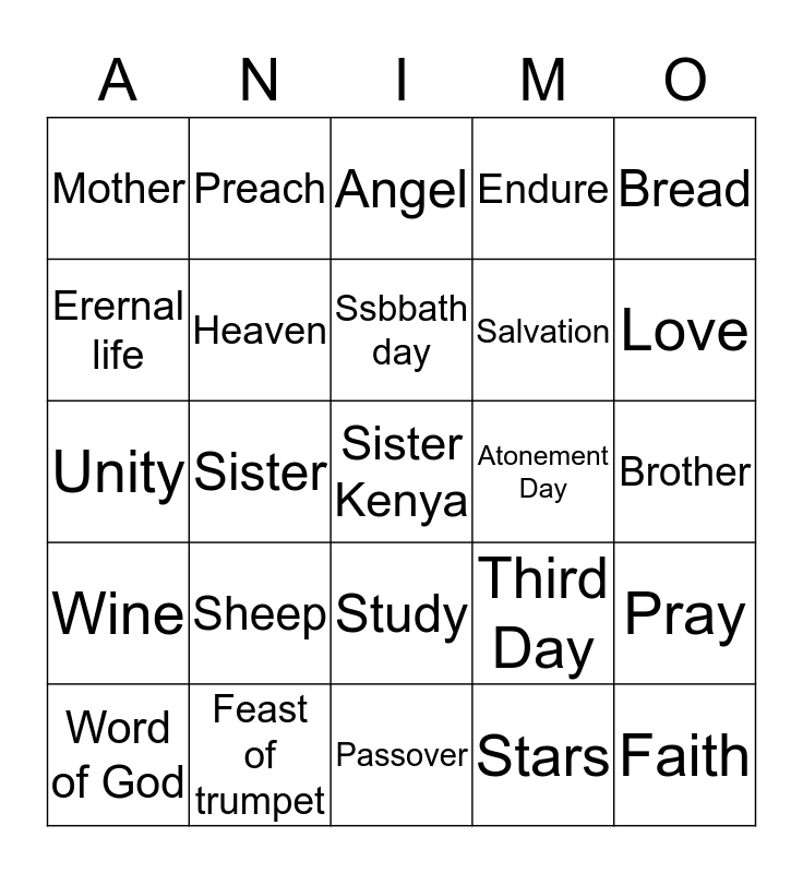 This bingo card has a free space and 24 words: Word of God, Sheep, Ssbbath day, Stars, Bread, Mother, Preach, Angel, Atonement Day, Brother, Unity, Heaven, Third Day, Pray, Erernal life, Feast of trumpet, Passover, Endure, Love, Wine, Sister, Study, Salvation and Faith.