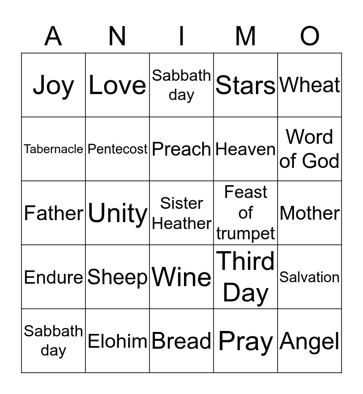 This bingo card has a free space and 24 words: Sabbath day, Sheep, Preach, Pray, Wheat, Joy, Love, Sabbath day, Feast of trumpet, Mother, Father, Pentecost, Third Day, Salvation, Tabernacle, Elohim, Bread, Stars, Word of God, Endure, Unity, Wine, Heaven and Angel.