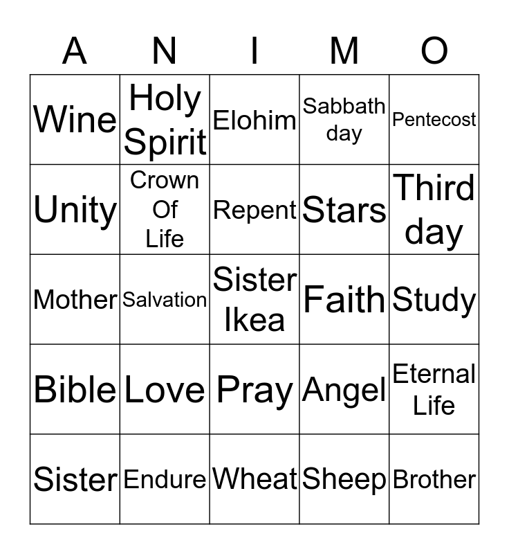 This bingo card has a free space and 24 words: Sister, Love, Repent, Sheep, Pentecost, Wine, Holy Spirit, Elohim, Faith, Study, Mother, Crown Of Life, Angel, Eternal Life, Unity, Endure, Wheat, Sabbath day, Third day, Bible, Salvation, Pray, Stars and Brother.
