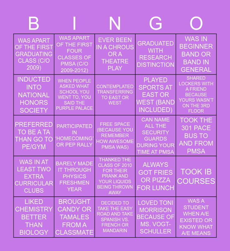 This bingo card has a free space and 24 words: LIKED CHEMISTRY BETTER THAN BIOLOGY, BARELY MADE IT THROUGH PHYSICS FRESHMEN YEAR, CONTEMPLATED TRANSFERRING TO EAST OR WEST, LOVED TONI MORRISON BECAUSE OF MS. VOGT-SCHULLER, WAS IN BEGINNER BAND OR BAND IN GENERAL, WAS APART OF THE FIRST GRADUATING CLASS (C/O 2009), WAS APART OF THE FIRST FOUR CLASSES OF PMSA (C/O 2009-2012), EVER BEEN IN A CHROUS OR A THEATRE PLAY, CAN NAME ALL THE SECURITY GUARDS DURING YOUR TIME AT PMSA, TOOK THE 301 PACE BUS TO AND FROM PMSA, PREFERRED TO BE A TA THAN GO TO PE/GYM, WHEN PEOPLE ASKED WHAT SCHOOL YOU WENT TO, YOU SAID THE PURPLE PALACE, ALWAYS GOT FRIES OR PIZZA FOR LUNCH, TOOK IB COURSES, INDUCTED INTO NATIONAL HONORS SOCIETY, BROUGHT CANDY OR TAMALES FROM A CLASSMATE, DECIDED TO TAKE THE EASY ROAD AND TAKE SPANISH VS. FRENCH OR MANDARIN, GRADUATED WITH RESEARCH DISTINCTION, SHARED LOCKERS WITH A FRIEND BECAUSE YOURS WASN’T ON THE 3RD FLOOR, WAS IN AT LEAST TWO EXTRA CURRICULAR CLUBS, PARTICIPATED IN ‘HOMECOMING’ OR PEP RALLY, THANKED THE CLASS OF 2010 FOR THEIR PRANK AND YOUR LIQUIDS BEING THROWN AWAY, PLAYED SPORTS AT EAST OR WEST (BAND INCLUDED) and WAS A STUDENT WHEN A/E EXISTED OR KNOW WHAT A/E MEANS.