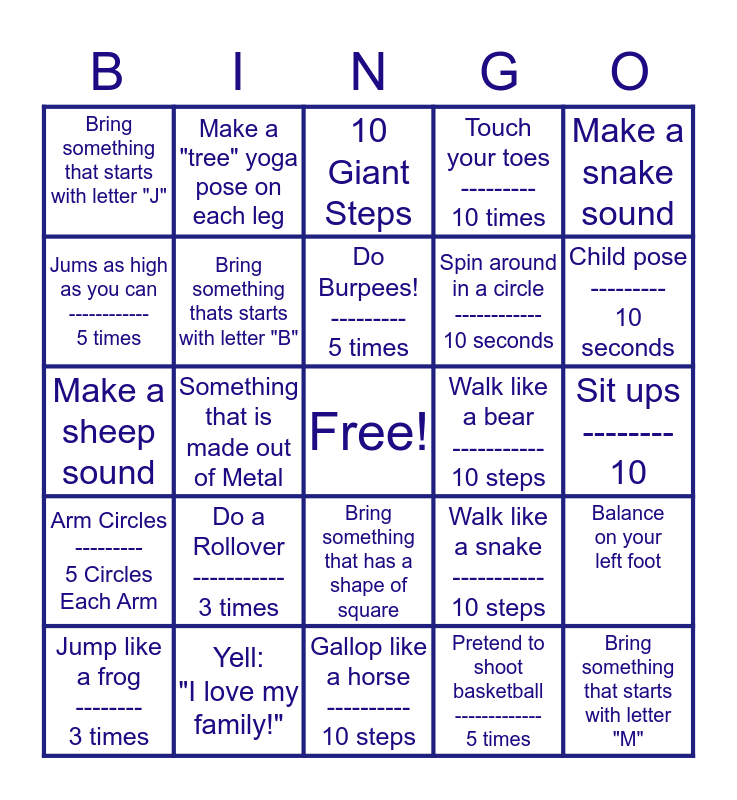 This bingo card has a free space and 24 words: Do a Rollover ----------- 3 times, Yell: "I love my family!", Do Burpees! --------- 5 times, Jump like a frog -------- 3 times, Make a snake sound, Bring something that starts with letter "J", Jums as high as you can ------------ 5 times, Make a "tree" yoga pose on each leg, Walk like a bear ----------- 10 steps, Bring something that has a shape of square, Spin around in a circle ------------ 10 seconds, Make a sheep sound, Walk like a snake ----------- 10 steps, Balance on your left foot, Bring something thats starts with letter "B", Pretend to shoot basketball ------------- 5 times, Sit ups -------- 10, 10 Giant Steps, Child pose --------- 10 seconds, Something that is made out of Metal, Bring something that starts with letter "M", Arm Circles --------- 5 Circles Each Arm, Touch your toes --------- 10 times and Gallop like a horse ---------- 10 steps.
