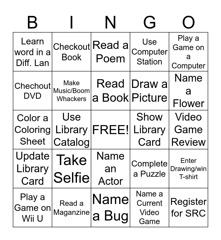 This bingo card has a free space and 24 words: Take Selfie, Read a Maganzine, Read a Book, Play a Game on Wii U, Play a Game on a Computer, Learn word in a Diff. Lan, Chechout DVD, Checkout Book, Show Library Card, Name an Actor, Draw a Picture, Color a Coloring Sheet, Complete a Puzzle, Enter Drawing/win T-shirt, Make Music/Boom Whackers, Name a Current Video Game, Video Game Review, Read a Poem, Name a Flower, Use Library Catalog, Register for SRC, Update Library Card, Use Computer Station and Name a Bug.