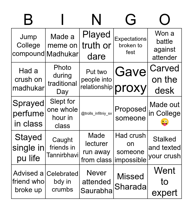 This bingo card has a free space and 24 words: Caught friends in Tannirbhavi, Celebrated bdy in crumbs, Put two people into relationship, Advised a friend who broke up, Won a battle against attender, Jump College compound, Had a crush on madhukar, Made a meme on Madhukar, Proposed someone, Made lecturer run away from class, Gave proxy, Sprayed perfume in class, Had crush on someone impossible, Stalked and texted your crush, Photo during traditional Day, Missed Sharada, Made out in College 😜, Played truth or dare, Carved on the desk, Slept for one whole hour in class, Went to expert, Stayed single in pu life, Expectations broken to fest and Never attended Saurabha.