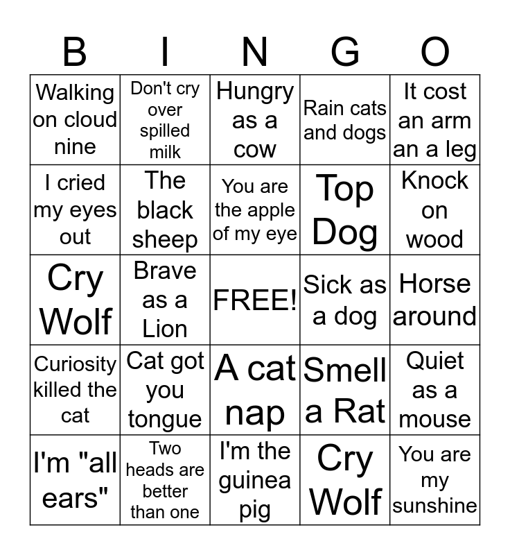 This bingo card has a free space and 24 words: Cat got you tongue, Two heads are better than one, You are the apple of my eye, I'm "all ears", It cost an arm an a leg, Walking on cloud nine, I cried my eyes out, Don't cry over spilled milk, Sick as a dog, A cat nap, Top Dog, Cry Wolf, Smell a Rat, Quiet as a mouse, The black sheep, Cry Wolf, Horse around, Hungry as a cow, Knock on wood, Brave as a Lion, You are my sunshine, Curiosity killed the cat, Rain cats and dogs and I'm the guinea pig.