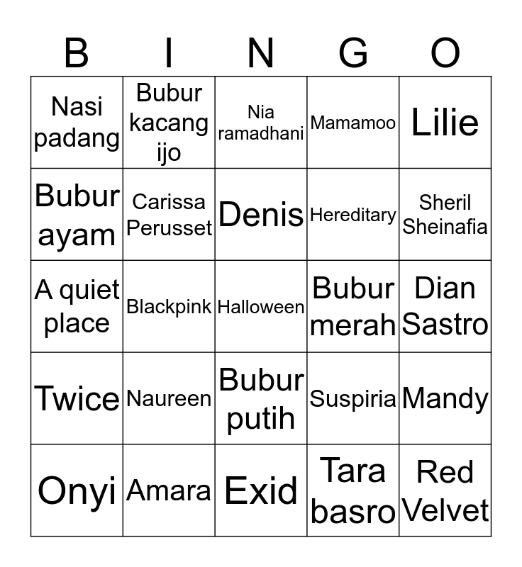 This bingo card has a free space and 24 words: Naureen, Amara, Denis, Onyi, Lilie, Nasi padang, Bubur ayam, Bubur kacang ijo, Bubur merah, Bubur putih, Hereditary, A quiet place, Suspiria, Mandy, Carissa Perusset, Tara basro, Dian Sastro, Nia ramadhani, Sheril Sheinafia, Blackpink, Red Velvet, Twice, Mamamoo and Exid.