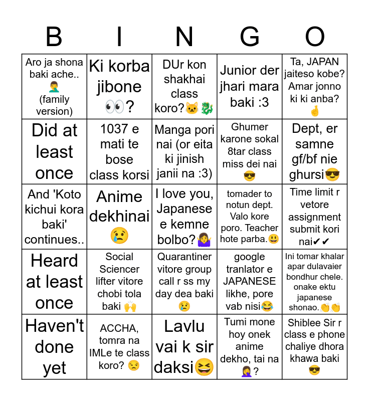 This bingo card has 25 words: Heard at least once, ACCHA, tomra na IMLe te class koro? π, I love you, Japanese e kemne bolbo?π€·ββοΈ, Tumi mone hoy onek anime dekho, tai naπ€¦ββοΈ?, Ta, JAPAN jaiteso kobe? Amar jonno ki ki anba?π€, Aro ja shona baki ache..π€¦ββοΈ (family version), Ki korba jiboneπ?, DUr kon shakhai class koro?π±βπ, tomader to notun dept. Valo kore poro. Teacher hote parba.π, Ini tomar khalar apar dulavaier bondhur chele. onake ektu japanese shonao.ππ, Did at least once, 1037 e mati te bose class korsi, Lavlu vai k sir daksiπ, google tranlator e JAPANESE likhe, pore vab nisiπ, Dept, er samne gf/bf nie ghursiπ, Haven't done yet, Anime dekhinai π’, Manga pori nai (or eita ki jinish janii na :3), Ghumer karone sokal 8tar class miss dei nai π, Time limit r vetore assignment submit kori naiββ, And 'Koto kichui kora baki' continues.., Social Sciencer lifter vitore chobi tola baki π, Quarantiner vitore group call r ss my day dea bakiπ’, Junior der jhari mara baki :3 and Shiblee Sir r class e phone chaliye dhora khawa baki π.