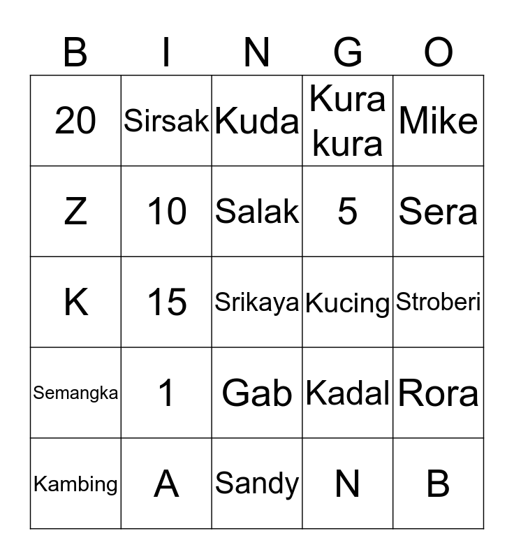 This bingo card has a free space and 24 words: 1, A, Salak, Kambing, Mike, 20, Z, Sirsak, Kucing, Gab, 5, K, Kadal, Rora, 10, N, Stroberi, Kuda, Sera, 15, B, Semangka, Kura kura and Sandy.