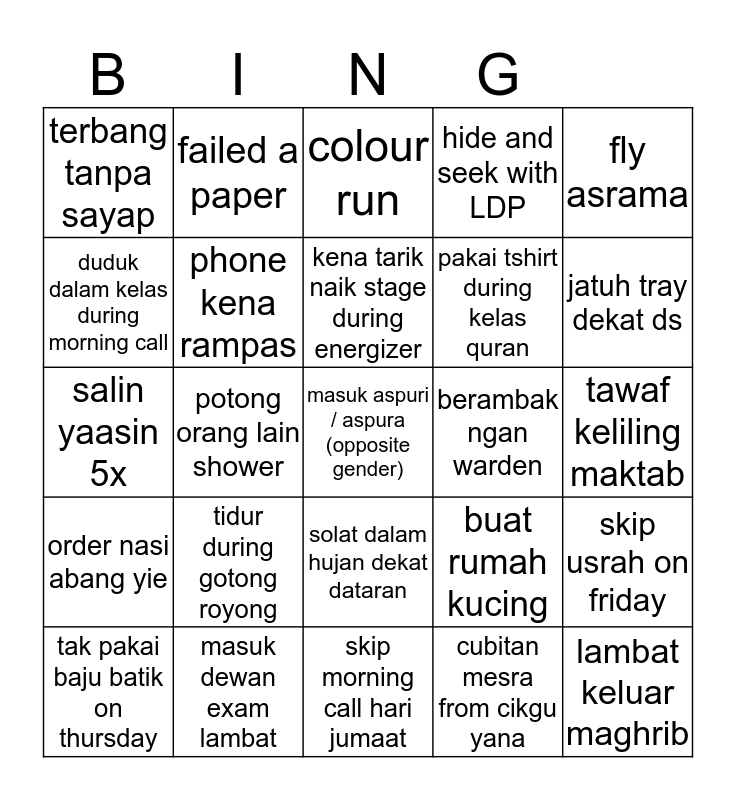 This bingo card has a free space and 29 words: skip prep, masuk dewan exam lambat, colour run, skip tuesday talk by ustaz rosli, fly asrama, terbang tanpa sayap, phone kena rampas, kena tarik naik stage during energizer, berambak ngan warden, skip usrah on friday, tak pakai baju batik on thursday, potong orang lain shower, cubitan mesra from cikgu yana, lambat keluar maghrib, salin yaasin 5x, tidur kat surau during exam week, skip morning call hari jumaat, buat rumah kucing, jatuh tray dekat ds, order nasi abang yie, tidur during gotong royong, lantern night, pakai tshirt during kelas quran, tawaf keliling maktab, duduk dalam kelas during morning call, failed a paper, solat dalam hujan dekat dataran, hide and seek with LDP and gaduh ngan junior.