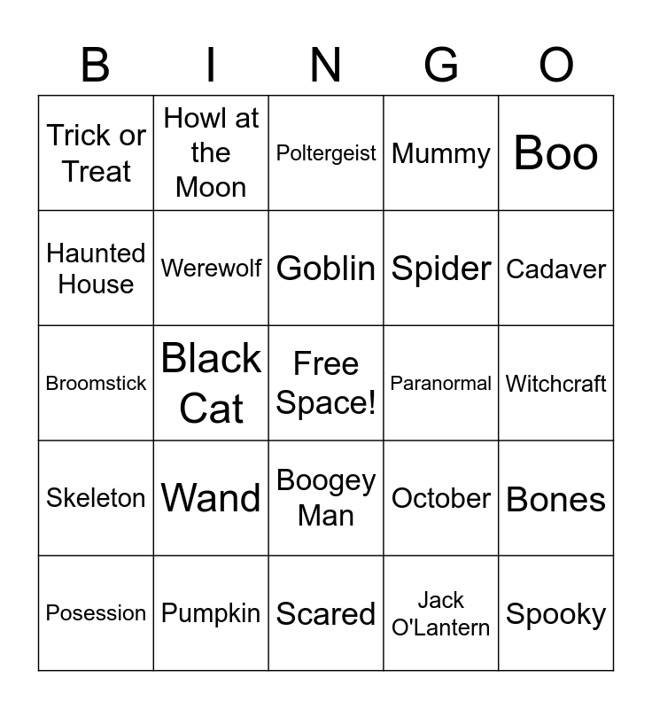 This bingo card has a free space and 59 words: Ghost, Pumpkin, Witch, Skeleton, Jack O'Lantern, Vampire, Werewolf, Devil, Spider, Snake, Mummy, Spirit, Haunted House, Cemetery, Graveyard, Trick or Treat, Spooky, Boo, Ghoul, Goblin, Paranormal, Poltergeist, Posession, Bones, Fangs, Claws, Bat, Casket, Cadaver, Crypt, Eerie, Full Moon, Tombstone, Magic Potion, Howl at the Moon, Skull, Tomb, Black Cat, Cauldron, Broomstick, Hocus Pocus, Wand, Witchcraft, Spells, Grim Reaper, Monsters, Wizard, Zombie, Boogey Man, Scared, Scream, Candy, Costumes, Scary Stories, Masks, October, Halloween, Face Paint and Sleepy Hollow.