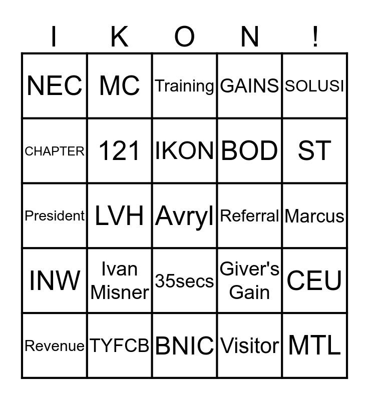 This bingo card has a free space and 24 words: Ivan Misner, TYFCB, IKON, Revenue, SOLUSI, NEC, CHAPTER, MC, Referral, 35secs, BOD, President, Giver's Gain, CEU, 121, Visitor, Marcus, Training, ST, LVH, MTL, INW, GAINS and BNIC.