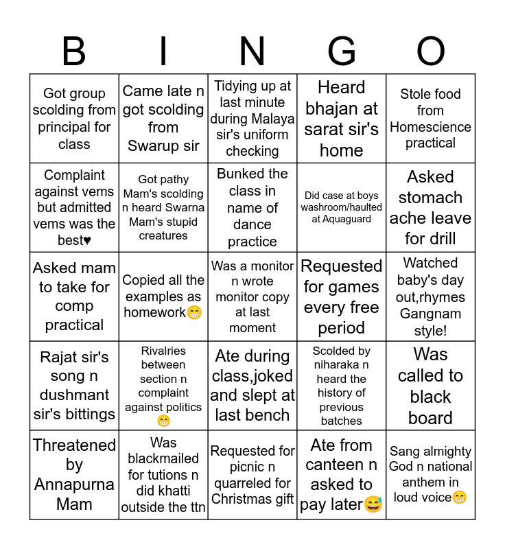 This bingo card has 30 words: Was blackmailed for tutions n did khatti outside the ttn, Went to common room?, Copied all the examples as homework😁, Had name written on the blackboard n quarreled to erase it, Got group scolding from principal for class, Tidying up at last minute during Malaya sir's uniform checking, Got pathy Mam's scolding n heard Swarna Mam's stupid creatures, Ate during class,joked and slept at last bench, Requested for games every free period, Requested for picnic n quarreled for Christmas gift, Watched baby's day out,rhymes Gangnam style!, Was a monitor n wrote monitor copy at last moment, Ate from canteen n asked to pay later😅, Sang almighty God n national anthem in loud voice😁, Asked stomach ache leave for drill, Forgotten to bring copy excuse, Scolded by niharaka n heard the history of previous batches, Rajat sir's song n dushmant sir's bittings, Rivalries between section n complaint against politics 😁, Stole food from Homescience practical, Asked mam to take for comp practical, Cried for mark n asked for half mark, Came late n got scolding from Swarup sir, Did case at boys washroom/haulted at Aquaguard, Complaint against vems but admitted vems was the best♥️, Heard bhajan at sarat sir's home, Was called to black board, Threatened by Annapurna Mam, Bunked the class in name of dance practice and Asked to go to field for drill.