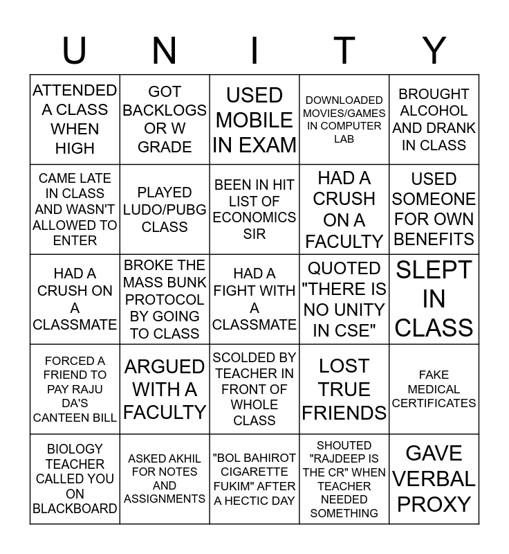 This bingo card has a free space and 24 words: ARGUED WITH A FACULTY, ASKED AKHIL FOR NOTES AND ASSIGNMENTS, BEEN IN HIT LIST OF ECONOMICS SIR, BIOLOGY TEACHER CALLED YOU ON BLACKBOARD, BROUGHT ALCOHOL AND DRANK IN CLASS, ATTENDED A CLASS WHEN HIGH, CAME LATE IN CLASS AND WASN'T ALLOWED TO ENTER, GOT BACKLOGS OR W GRADE, QUOTED "THERE IS NO UNITY IN CSE", SCOLDED BY TEACHER IN FRONT OF WHOLE CLASS, HAD A CRUSH ON A FACULTY, HAD A CRUSH ON A CLASSMATE, LOST TRUE FRIENDS, FAKE MEDICAL CERTIFICATES, PLAYED LUDO/PUBG CLASS, SHOUTED "RAJDEEP IS THE CR" WHEN TEACHER NEEDED SOMETHING, SLEPT IN CLASS, USED MOBILE IN EXAM, USED SOMEONE FOR OWN BENEFITS, BROKE THE MASS BUNK PROTOCOL BY GOING TO CLASS, GAVE VERBAL PROXY, FORCED A FRIEND TO PAY RAJU DA'S CANTEEN BILL, DOWNLOADED MOVIES/GAMES IN COMPUTER LAB and "BOL BAHIROT CIGARETTE FUKIM" AFTER A HECTIC DAY.