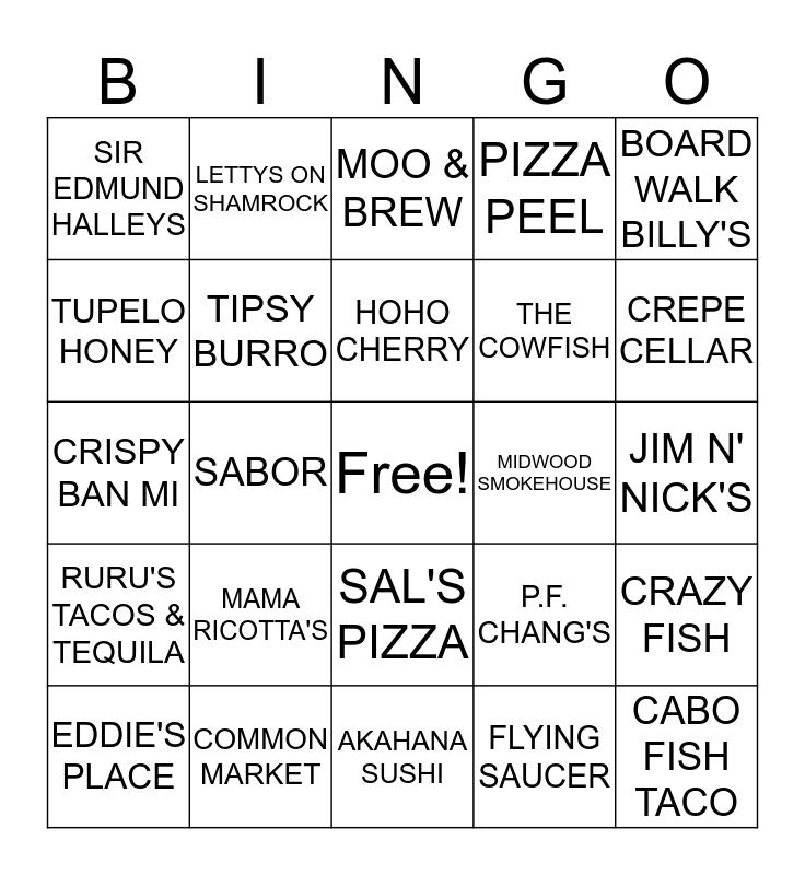 This bingo card has a free space and 30 words: COMMON MARKET, THE WATERMAN, SABOR, THREE AMIGOS, SIR EDMUND HALLEYS, MOO & BREW, TIPSY BURRO, SAL'S PIZZA, MIDWOOD SMOKEHOUSE, AKAHANA SUSHI, JIM N' NICK'S, CABO FISH TACO, FLYING SAUCER, LUPIE'S, CREPE CELLAR, MAC'S SPEED SHOP, P.F. CHANG'S, RURU'S TACOS & TEQUILA, MAMA RICOTTA'S, BOARD WALK BILLY'S, CRISPY BAN MI, SHOMARS, LETTYS ON SHAMROCK, THE COWFISH, TUPELO HONEY, PIZZA PEEL, CRAZY FISH, EDDIE'S PLACE, HOHO CHERRY and HABERDISH.
