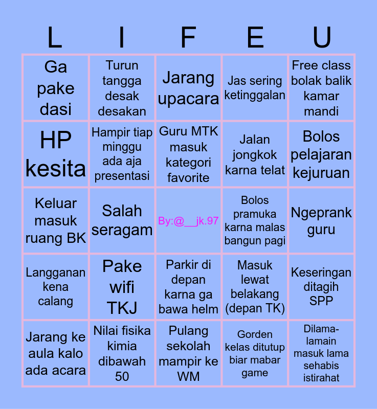 This bingo card has a free space and 24 words: Jarang ke aula kalo ada acara, Pake wifi TKJ, Guru MTK masuk kategori favorite, Gorden kelas ditutup biar mabar game, Free class bolak balik kamar mandi, Ga pake dasi, Turun tangga desak desakan, Jarang upacara, Bolos pramuka karna malas bangun pagi, Ngeprank guru, Keluar masuk ruang BK, Hampir tiap minggu ada aja presentasi, Masuk lewat belakang (depan TK), Keseringan ditagih SPP, HP kesita, Nilai fisika kimia dibawah 50, Pulang sekolah mampir ke WM, Jas sering ketinggalan, Bolos pelajaran kejuruan, Langganan kena calang, Salah seragam, Parkir di depan karna ga bawa helm, Jalan jongkok karna telat and Dilama-lamain masuk lama sehabis istirahat.