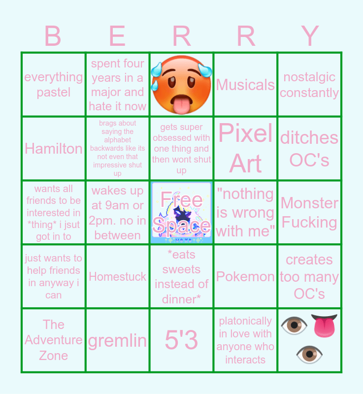 This bingo card has 1 images, a free space and 23 words: Homestuck, gremlin, gets super obsessed with one thing and then wont shut up, The Adventure Zone, nostalgic constantly, everything pastel, Hamilton, spent four years in a major and hate it now, "nothing is wrong with me", *eats sweets instead of dinner*, Pixel Art, wants all friends to be interested in *thing* i jsut got in to, Pokemon, creates too many OC's, brags about saying the alphabet backwards like its not even that impressive shut up, platonically in love with anyone who interacts, Monster Fucking, ditches OC's, wakes up at 9am or 2pm. no in between, 👁👅👁, just wants to help friends in anyway i can, Musicals and 5'3.