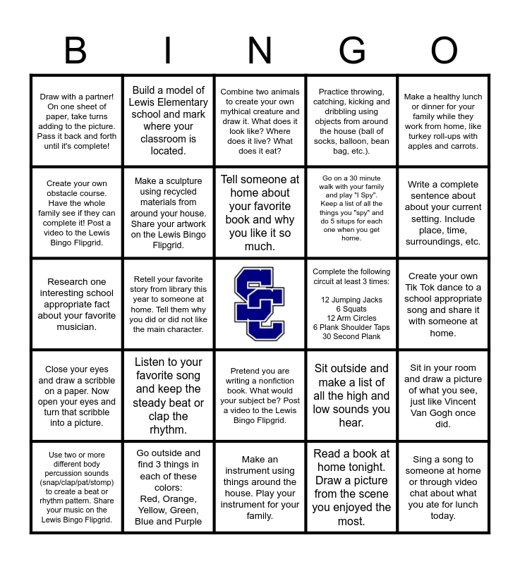 This bingo card has a free space and 24 words: Listen to your favorite song and keep the steady beat or clap the rhythm., Go outside and find 3 things in each of these colors: Red, Orange, Yellow, Green, Blue and Purple, Tell someone at home about your favorite book and why you like it so much., Use two or more different body percussion sounds (snap/clap/pat/stomp) to create a beat or rhythm pattern. Share your music on the Lewis Bingo Flipgrid., Make a healthy lunch or dinner for your family while they work from home, like turkey roll-ups with apples and carrots., Draw with a partner! On one sheet of paper, take turns adding to the picture. Pass it back and forth until it's complete!, Create your own obstacle course. Have the whole family see if they can complete it! Post a video to the Lewis Bingo Flipgrid., Build a model of Lewis Elementary school and mark where your classroom is located., Complete the following circuit at least 3 times: 12 Jumping Jacks 6 Squats 12 Arm Circles 6 Plank Shoulder Taps 30 Second Plank, Pretend you are writing a nonfiction book. What would your subject be? Post a video to the Lewis Bingo Flipgrid., Go on a 30 minute walk with your family and play "I Spy". Keep a list of all the things you "spy" and do 5 situps for each one when you get home., Research one interesting school appropriate fact about your favorite musician., Sit outside and make a list of all the high and low sounds you hear., Sit in your room and draw a picture of what you see, just like Vincent Van Gogh once did., Make a sculpture using recycled materials from around your house. Share your artwork on the Lewis Bingo Flipgrid., Read a book at home tonight. Draw a picture from the scene you enjoyed the most., Create your own Tik Tok dance to a school appropriate song and share it with someone at home., Combine two animals to create your own mythical creature and draw it. What does it look like? Where does it live? What does it eat?, Write a complete sentence about about your current setting. Include place, time, surroundings, etc., Retell your favorite story from library this year to someone at home. Tell them why you did or did not like the main character., Sing a song to someone at home or through video chat about what you ate for lunch today., Close your eyes and draw a scribble on a paper. Now open your eyes and turn that scribble into a picture., Practice throwing, catching, kicking and dribbling using objects from around the house (ball of socks, balloon, bean bag, etc.). and Make an instrument using things around the house. Play your instrument for your family..