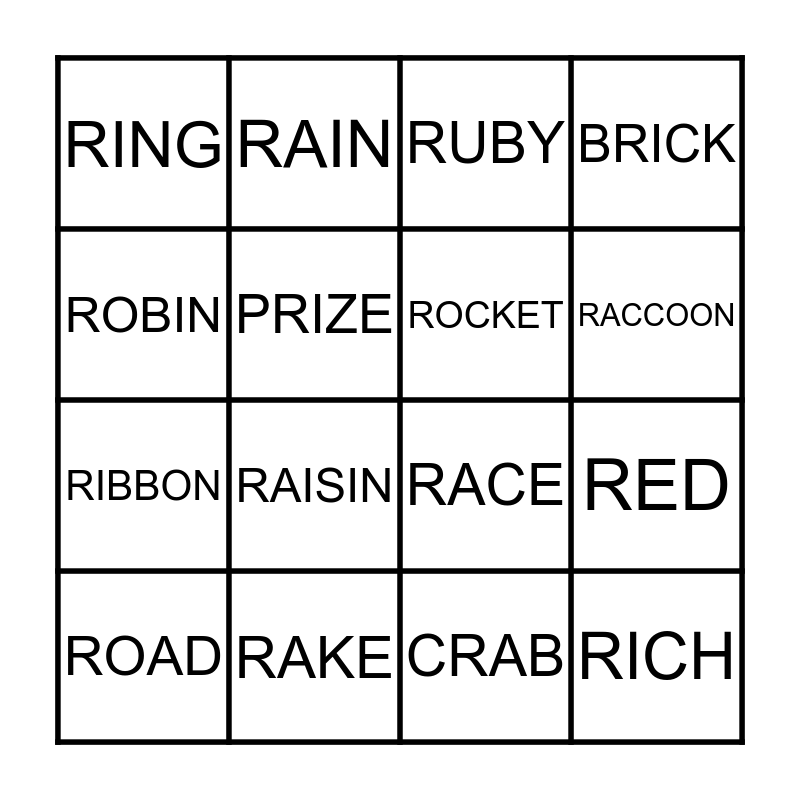 This bingo card has 20 words: RED, RABBIT, RUBY, RADIO, ROAD, ROBIN, RAKE, RING, RIBBON, RAIN, RAISIN, RACE, PRIZE, RICH, ROCKET, RUN, RACCOON, BRICK, CRAB and DRUM.