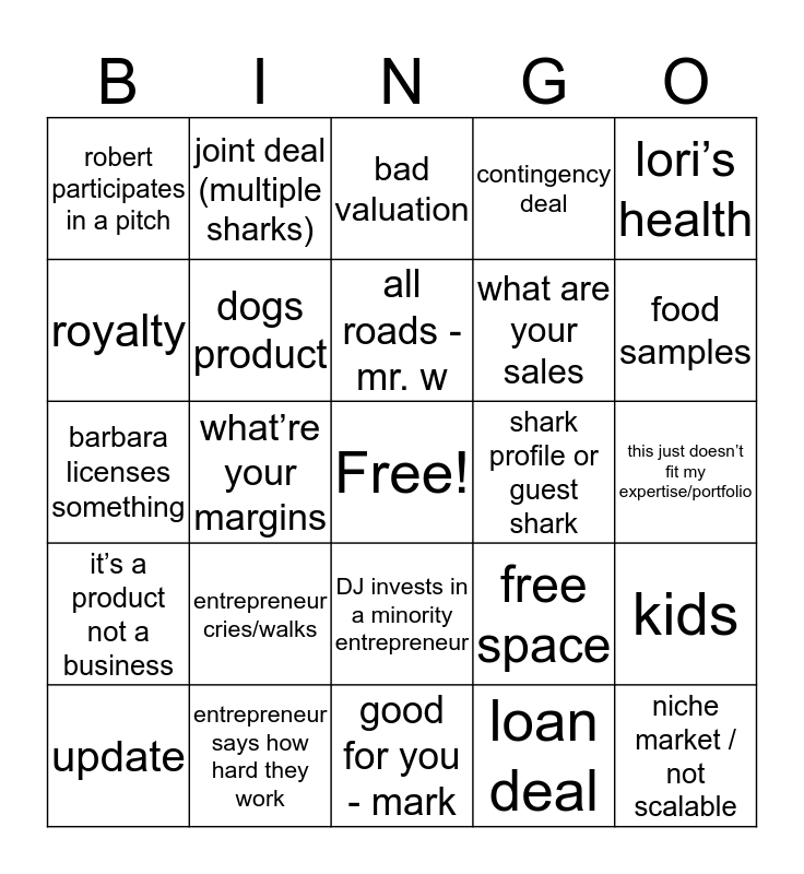 This bingo card has a free space and 25 words: entrepreneur cries/walks, good for you - mark, all roads - mr. w, update, lori’s health, robert participates in a pitch, royalty, joint deal (multiple sharks), shark profile or guest shark, DJ invests in a minority entrepreneur, what are your sales, barbara licenses something, free space, kids, dogs product, i like money - mr. w, this just doesn’t fit my expertise/portfolio, bad valuation, food samples, what’re your margins, niche market / not scalable, entrepreneur says how hard they work, it’s a product not a business, contingency deal and loan deal.