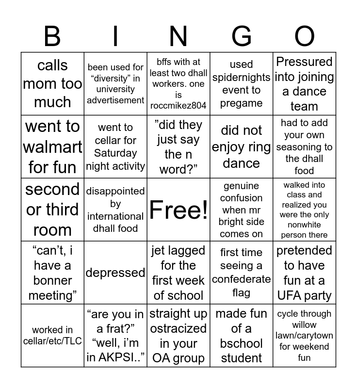 This bingo card has a free space and 24 words: depressed, “are you in a frat?” “well, i’m in AKPSI..”, ”did they just say the n word?”, worked in cellar/etc/TLC, Pressured into joining a dance team, calls mom too much, went to walmart for fun, been used for “diversity” in university advertisement, genuine confusion when mr bright side comes on, jet lagged for the first week of school, did not enjoy ring dance, second or third room, first time seeing a confederate flag, pretended to have fun at a UFA party, went to cellar for Saturday night activity, made fun of a bschool student, walked into class and realized you were the only nonwhite person there, bffs with at least two dhall workers. one is roccmikez804, had to add your own seasoning to the dhall food, disappointed by international dhall food, cycle through willow lawn/carytown for weekend fun, “can’t, i have a bonner meeting”, used spidernights event to pregame and straight up ostracized in your OA group.