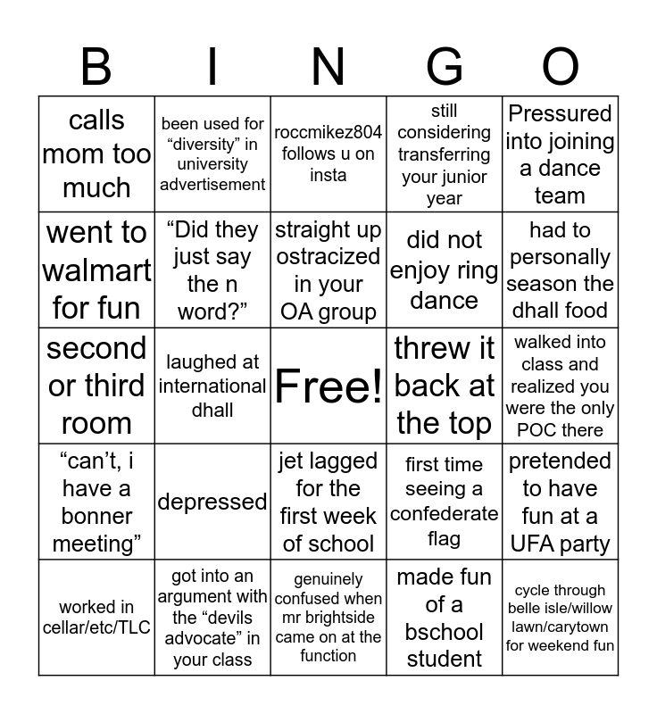 This bingo card has a free space and 24 words: depressed, got into an argument with the “devils advocate” in your class, straight up ostracized in your OA group, worked in cellar/etc/TLC, Pressured into joining a dance team, calls mom too much, went to walmart for fun, been used for “diversity” in university advertisement, threw it back at the top, jet lagged for the first week of school, did not enjoy ring dance, second or third room, first time seeing a confederate flag, pretended to have fun at a UFA party, “Did they just say the n word?”, made fun of a bschool student, walked into class and realized you were the only POC there, roccmikez804 follows u on insta, had to personally season the dhall food, laughed at international dhall, cycle through belle isle/willow lawn/carytown for weekend fun, “can’t, i have a bonner meeting”, still considering transferring your junior year and genuinely confused when mr brightside came on at the function.