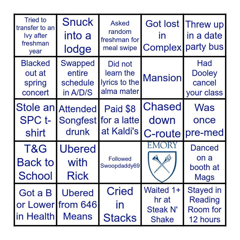 This bingo card has 1 images and 24 words: Ubered with Rick, Cried in Stacks, Did not learn the lyrics to the alma mater, Got a B or Lower in Health, Threw up in a date party bus, Tried to transfer to an Ivy after freshman year, Blacked out at spring concert, Snuck into a lodge, Chased down C-route, Followed Swoopdaddy69, Mansion, Stole an SPC t-shirt, Danced on a booth at Mags, Swapped entire schedule in A/D/S, Stayed in Reading Room for 12 hours, Was once pre-med, Asked random freshman for meal swipe, Had Dooley cancel your class, Attended Songfest drunk, Paid $8 for a latte at Kaldi's, Ubered from 646 Means, T&G Back to School, Got lost in Complex and Waited 1+ hr at Steak N' Shake.