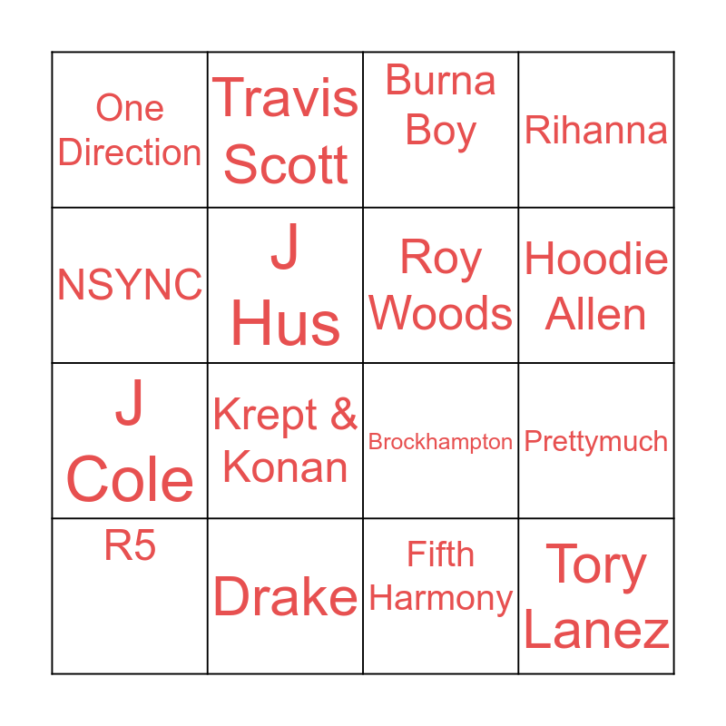 This bingo card has 16 words: Drake, Prettymuch, Burna Boy, One Direction, J Cole, Travis Scott, Brockhampton, Fifth Harmony, NSYNC, J Hus, R5, Rihanna, Krept & Konan, Hoodie Allen, Roy Woods and Tory Lanez.