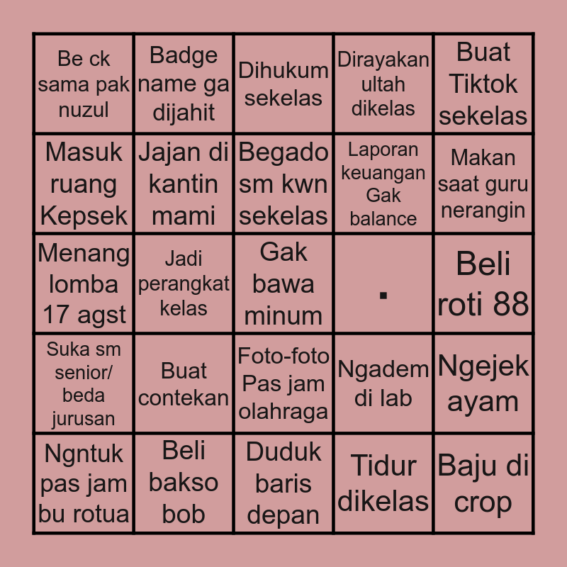 This bingo card has a free space and 24 words: Buat contekan, Beli bakso bob, Begado sm kwn sekelas, Ngntuk pas jam bu rotua, Buat Tiktok sekelas, Be ck sama pak nuzul, Masuk ruang Kepsek, Badge name ga dijahit, ., Foto-foto Pas jam olahraga, Laporan keuangan Gak balance, Menang lomba 17 agst, Ngadem di lab, Ngejek ayam, Jajan di kantin mami, Tidur dikelas, Beli roti 88, Dihukum sekelas, Makan saat guru nerangin, Jadi perangkat kelas, Baju di crop, Suka sm senior/ beda jurusan, Dirayakan ultah dikelas and Duduk baris depan.