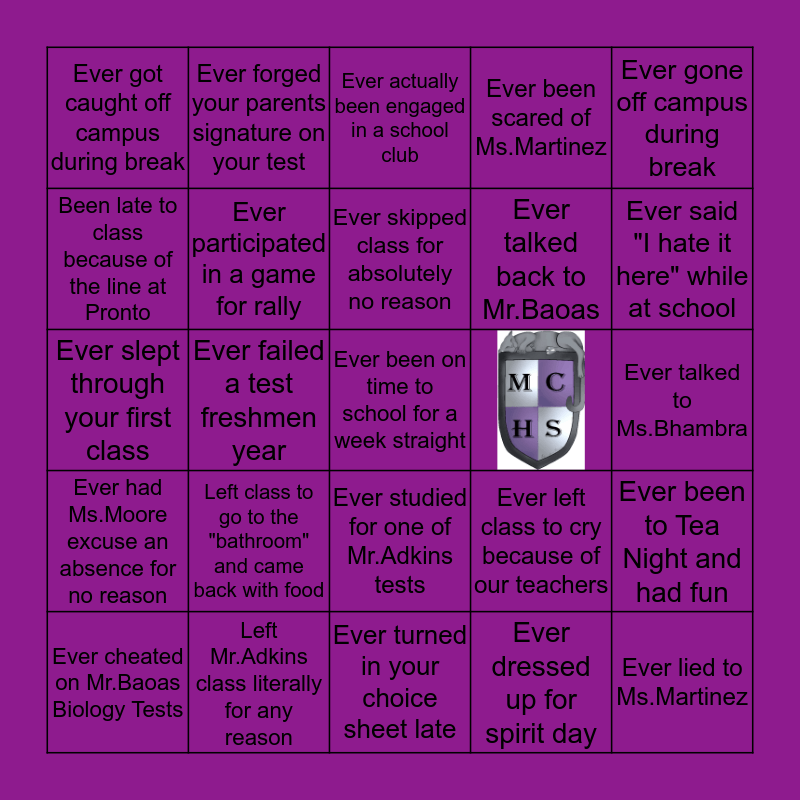 This bingo card has 1 images, a free space and 23 words: Left class to go to the "bathroom" and came back with food, Left Mr.Adkins class literally for any reason, Ever skipped class for absolutely no reason, Ever cheated on Mr.Baoas Biology Tests, Ever gone off campus during break, Ever got caught off campus during break, Been late to class because of the line at Pronto, Ever forged your parents signature on your test, Ever studied for one of Mr.Adkins tests, Ever talked back to Mr.Baoas, Ever slept through your first class, Ever left class to cry because of our teachers, Ever been to Tea Night and had fun, Ever participated in a game for rally, Ever dressed up for spirit day, Ever talked to Ms.Bhambra, Ever actually been engaged in a school club, Ever said "I hate it here" while at school, Ever failed a test freshmen year, Ever lied to Ms.Martinez, Ever had Ms.Moore excuse an absence for no reason, Ever been scared of Ms.Martinez and Ever turned in your choice sheet late.