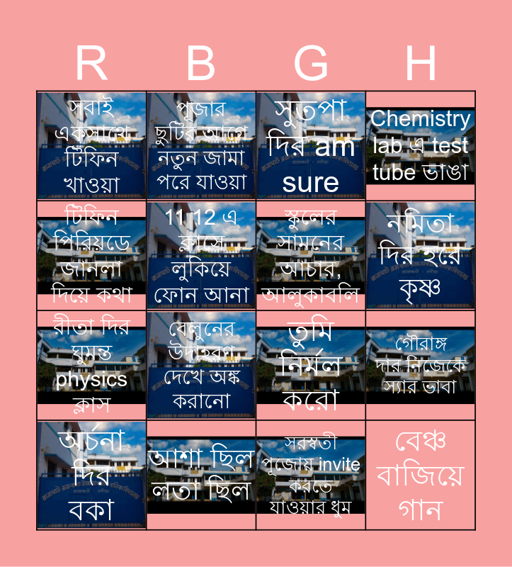 This bingo card has 15 images and 17 words: অর্চনা দির বকা, আশা ছিল লতা ছিল, সুতপা দির am sure, Chemistry lab এ test tube ভাঙা, রীতা দির ঘুমন্ত physics ক্লাস, 11 12 এ ক্লাসে লুকিয়ে ফোন আনা, তুমি নির্মল করো, নমিতা দির হরে কৃষ্ণ, টিফিন পিরিয়ডে জানলা দিয়ে কথা, বেলুনের উদাহরণ দেখে অঙ্ক করানো, সরস্বতী পূজোয় invite করতে যাওয়ার ধুম, গৌরাঙ্গ দার নিজেকে স্যার ভাবা, সবাই একসাথে টিফিন খাওয়া, পূজার ছুটির আগে নতুন জামা পরে যাওয়া, স্কুলের সামনের আচার, আলুকাবলি, বেঞ্চ বাজিয়ে গান and বেঞ্চ বাজিয়ে গান.