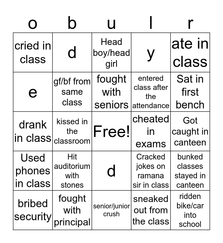 This bingo card has a free space and 29 words: stayed in hostel, fought with principal, Head boy/head girl, slept in class, ate in class, cried in class, gf/bf from same class, fought with seniors, cheated in exams, bunked classes stayed in canteen, bribed security, kissed in the classroom, sneaked out from the class, ridden bike/car into school, drank in class, Punished in class, senior/junior crush, Cracked jokes on ramana sir in class, Sat in first bench, Used phones in class, Hit auditorium with stones, lead sports team, entered class after the attendance, Got caught in canteen, e, d, d, y and obul reddy.