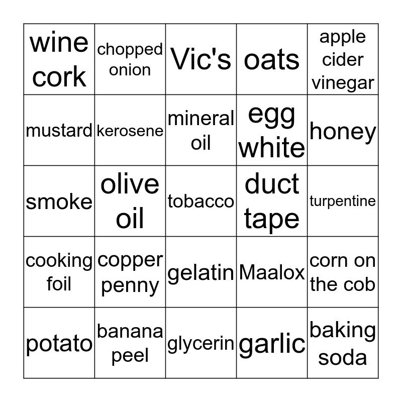 This bingo card has a free space and 24 words: copper penny, banana peel, mineral oil, potato, apple cider vinegar, wine cork, mustard, chopped onion, duct tape, gelatin, egg white, smoke, Maalox, corn on the cob, kerosene, garlic, turpentine, Vic's, honey, olive oil, baking soda, cooking foil, oats and glycerin.