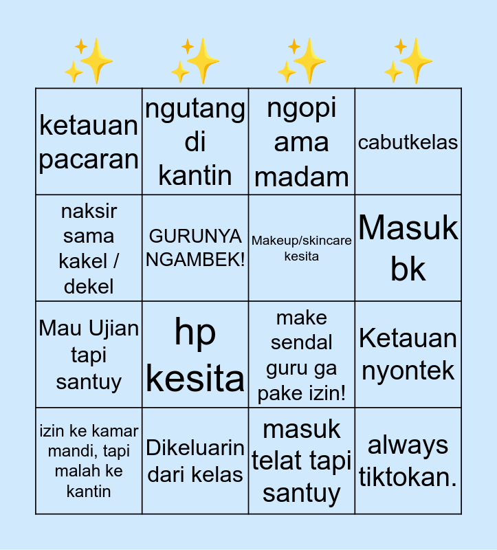 This bingo card has 16 words: izin ke kamar mandi, tapi malah ke kantin, Dikeluarin dari kelas, ngopi ama madam, cabutkelas, naksir sama kakel / dekel, ngutang di kantin, make sendal guru ga pake izin!, Ketauan nyontek, ketauan pacaran, GURUNYA NGAMBEK!, masuk telat tapi santuy, Masuk bk, Mau Ujian tapi santuy, hp kesita, Makeup/skincare kesita and always tiktokan..