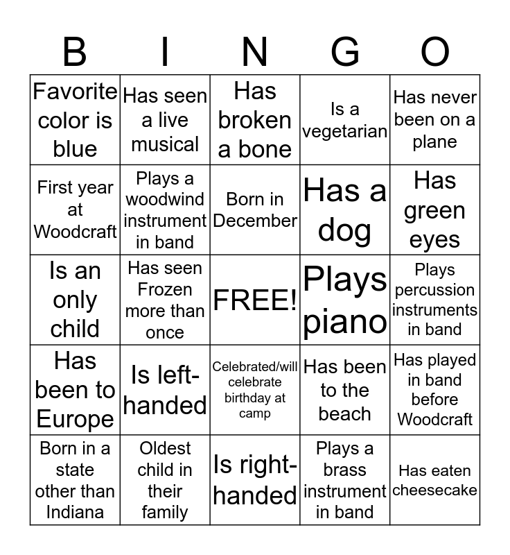 This bingo card has a free space and 24 words: Is left-handed, Oldest child in their family, Born in December, Born in a state other than Indiana, Has never been on a plane, Favorite color is blue, First year at Woodcraft, Has seen a live musical, Plays piano, Celebrated/will celebrate birthday at camp, Has a dog, Is an only child, Has been to the beach, Has played in band before Woodcraft, Plays a woodwind instrument in band, Plays a brass instrument in band, Plays percussion instruments in band, Has broken a bone, Has green eyes, Has seen Frozen more than once, Has eaten cheesecake, Has been to Europe, Is a vegetarian and Is right-handed.