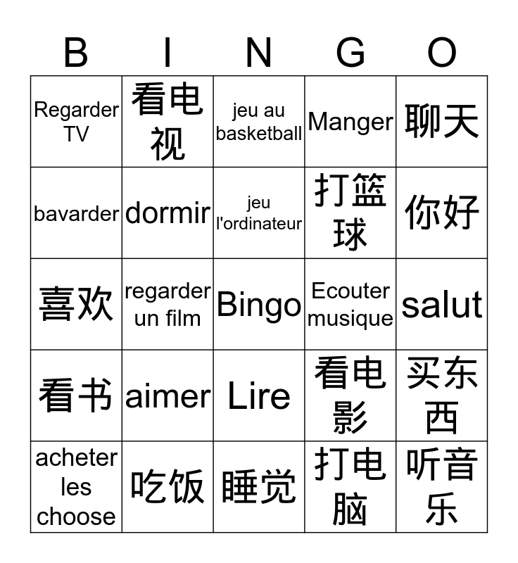 This bingo card has a free space and 24 words: aimer, 吃饭, jeu l'ordinateur, acheter les choose, 聊天, Regarder TV, bavarder, 看电视, Ecouter musique, Lire, 打篮球, 喜欢, 看电影, 买东西, dormir, 打电脑, salut, jeu au basketball, 你好, regarder un film, 听音乐, 看书, Manger and 睡觉.