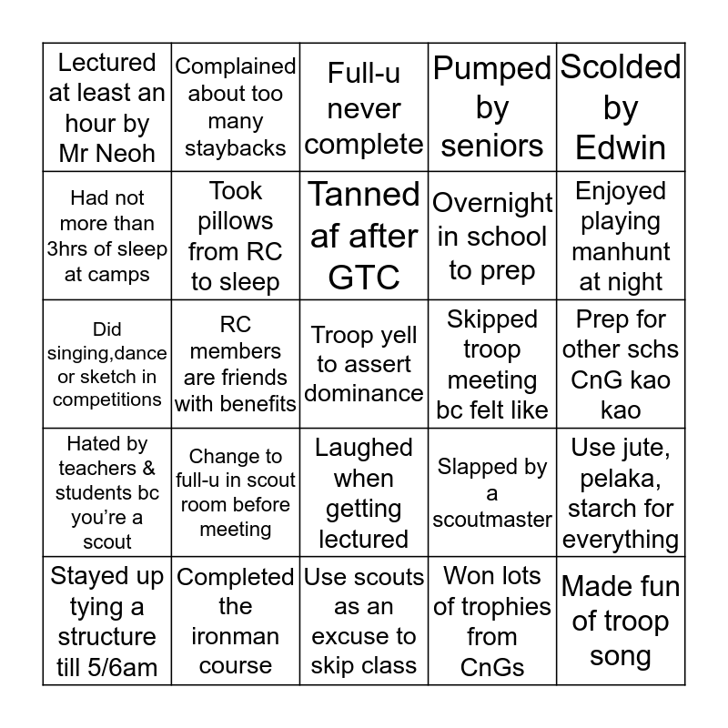 This bingo card has a free space and 24 words: Change to full-u in scout room before meeting, Completed the ironman course, Tanned af after GTC, Stayed up tying a structure till 5/6am, Scolded by Edwin, Lectured at least an hour by Mr Neoh, Had not more than 3hrs of sleep at camps, Complained about too many staybacks, Skipped troop meeting bc felt like, Laughed when getting lectured, Overnight in school to prep, Did singing,dance or sketch in competitions, Slapped by a scoutmaster, Use jute, pelaka, starch for everything, Took pillows from RC to sleep, Won lots of trophies from CnGs, Prep for other schs CnG kao kao, Full-u never complete, Enjoyed playing manhunt at night, RC members are friends with benefits, Made fun of troop song, Hated by teachers & students bc you’re a scout, Pumped by seniors and Use scouts as an excuse to skip class.