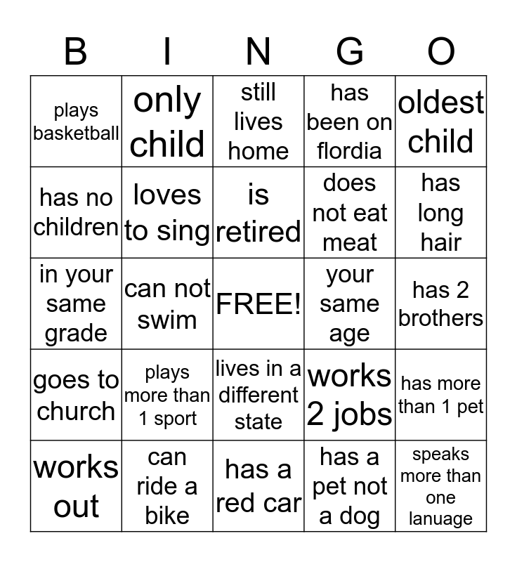 This bingo card has a free space and 24 words: plays more than 1 sport, can ride a bike, is retired, works out, oldest child, plays basketball, has no children, only child, your same age, lives in a different state, does not eat meat, in your same grade, works 2 jobs, has more than 1 pet, loves to sing, has a pet not a dog, has 2 brothers, still lives home, has long hair, can not swim, speaks more than one lanuage, goes to church, has been on flordia and has a red car.