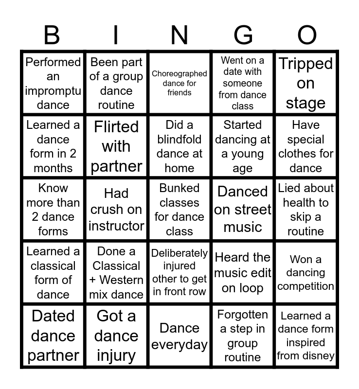 This bingo card has 25 words: Learned a classical form of dance, Got a dance injury, Bunked classes for dance class, Forgotten a step in group routine, Tripped on stage, Performed an impromptu dance, Been part of a group dance routine, Choreographed dance for friends, Danced on street music, Won a dancing competition, Learned a dance form in 2 months, Flirted with partner, Dance everyday, Heard the music edit on loop, Have special clothes for dance, Dated dance partner, Had crush on instructor, Did a blindfold dance at home, Started dancing at a young age, Lied about health to skip a routine, Know more than 2 dance forms, Done a Classical + Western mix dance, Deliberately injured other to get in front row, Went on a date with someone from dance class and Learned a dance form inspired from disney.