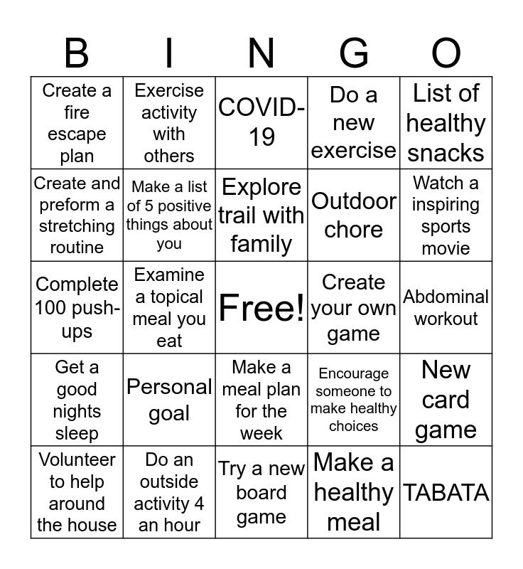 This bingo card has a free space and 24 words: Personal goal, Do an outside activity 4 an hour, Explore trail with family, Volunteer to help around the house, List of healthy snacks, Create a fire escape plan, Create and preform a stretching routine, Exercise activity with others, Create your own game, Make a meal plan for the week, Outdoor chore, Complete 100 push-ups, Encourage someone to make healthy choices, New card game, Make a list of 5 positive things about you, Make a healthy meal, Abdominal workout, COVID-19, Watch a inspiring sports movie, Examine a topical meal you eat, TABATA, Get a good nights sleep, Do a new exercise and Try a new board game.