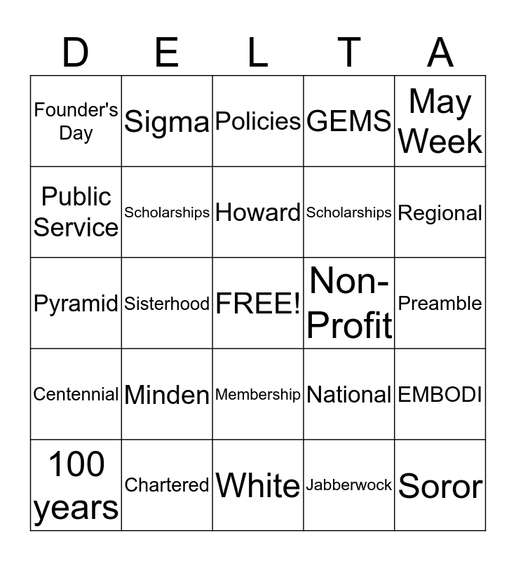 This bingo card has a free space and 50 words: Delta, Soror, Red, White, Minden, Alumnae, Sigma, Theta, Public Service, 1960, Scholarships, GEMS, EMBODI, National, 1913, 22 Women, Howard, Non-Profit, Grand Chapter, May Week, Sisterhood, Jabberwock, Founder's Day, Scholarships, Sorority, Academy, Regional, Conferences, Policies, Membership, Ritual, Regional, Committees, Initiation, Chartered, College, Ecumenical, Delta Hymn, Pin, Preamble, Ethics, Cotillion, Academy, Love, 100 years, Pyramid, Southwest, Delegate, Centennial and Executive Bd..