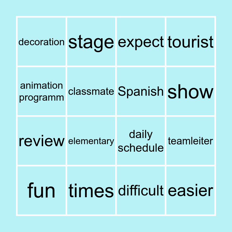 This bingo card has 16 words: times, teamleiter, expect, decoration, review, stage, daily schedule, difficult, animation programm, classmate, fun, tourist, elementary, show, Spanish and easier.