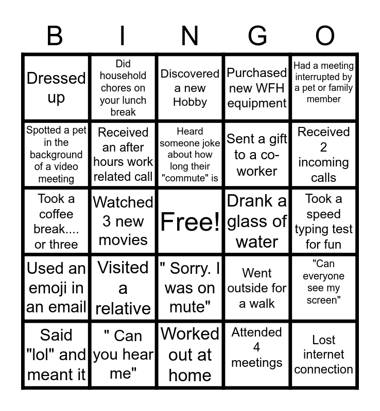 This bingo card has a free space and 24 words: Visited a relative, " Can you hear me", Heard someone joke about how long their "commute" is, Said "lol" and meant it, Had a meeting interrupted by a pet or family member, Dressed up, Spotted a pet in the background of a video meeting, Did household chores on your lunch break, Drank a glass of water, " Sorry. I was on mute", Sent a gift to a co-worker, Took a coffee break.... or three, Went outside for a walk, "Can everyone see my screen", Received an after hours work related call, Attended 4 meetings, Took a speed typing test for fun, Discovered a new Hobby, Received 2 incoming calls, Watched 3 new movies, Lost internet connection, Used an emoji in an email, Purchased new WFH equipment and Worked out at home.