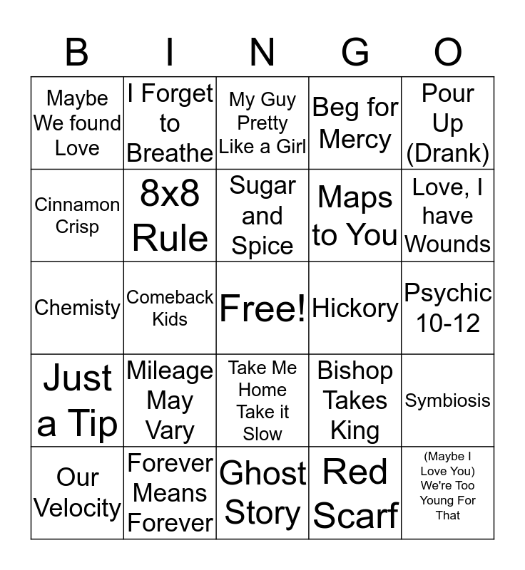 This bingo card has a free space and 24 words: Our Velocity, Mileage May Vary, Sugar and Spice, Red Scarf, Pour Up (Drank), Maybe We found Love, I Forget to Breathe, My Guy Pretty Like a Girl, Hickory, Psychic 10-12, Chemisty, 8x8 Rule, Bishop Takes King, Symbiosis, Cinnamon Crisp, Forever Means Forever, Ghost Story, Beg for Mercy, Love, I have Wounds, Just a Tip, Comeback Kids, Take Me Home Take it Slow, Maps to You and (Maybe I Love You) We're Too Young For That.