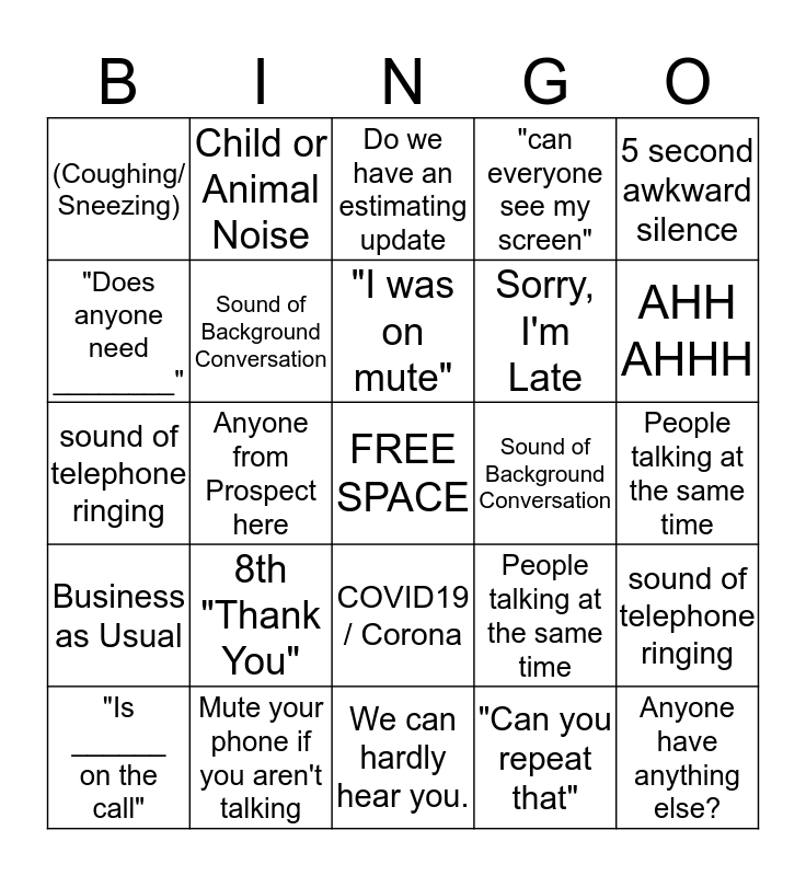 This bingo card has a free space and 24 words: "Is ______ on the call", 8th "Thank You", "I was on mute", "Can you repeat that", 5 second awkward silence, (Coughing/ Sneezing), Child or Animal Noise, Do we have an estimating update, Sound of Background Conversation, People talking at the same time, sound of telephone ringing, Sound of Background Conversation, People talking at the same time, sound of telephone ringing, "Does anyone need ________", Mute your phone if you aren't talking, We can hardly hear you., "can everyone see my screen", AHH AHHH, Business as Usual, Anyone from Prospect here, COVID19 / Corona, Sorry, I'm Late and Anyone have anything else?.