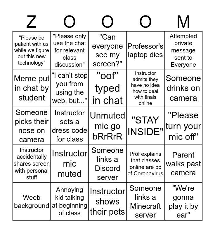 This bingo card has a free space and 24 words: Instructor mic muted, Annoying kid talking at beginning of class, "oof" typed in chat, Weeb background, Attempted private message sent to Everyone, "Please be patient with us while we figure out this new technology", Meme put in chat by student, "Please only use the chat for relevant class discussion", "STAY INSIDE", Someone links a Discord server, Instructor admits they have no idea how to deal with finals online, Someone picks their nose on camera, Prof explains that classes online are bc of Coronavirus, Parent walks past camera, "I can't stop you from using the web, but...", Someone links a Minecraft server, "Please turn your mic off", "Can everyone see my screen?", Someone drinks on camera, Instructor sets a dress code for class, "We're gonna play it by ear", Instructor accidentally shares screen with personal stuff, Professor's laptop dies and Instructor shows their pets.