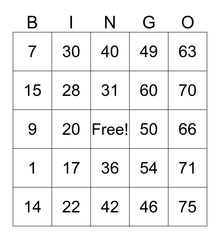 This bingo card has a free space and 24 words: 14, 17, 31, 46, 63, 7, 30, 40, 50, 66, 9, 28, 54, 71, 15, 22, 42, 49, 70, 1, 20, 36, 60 and 75.