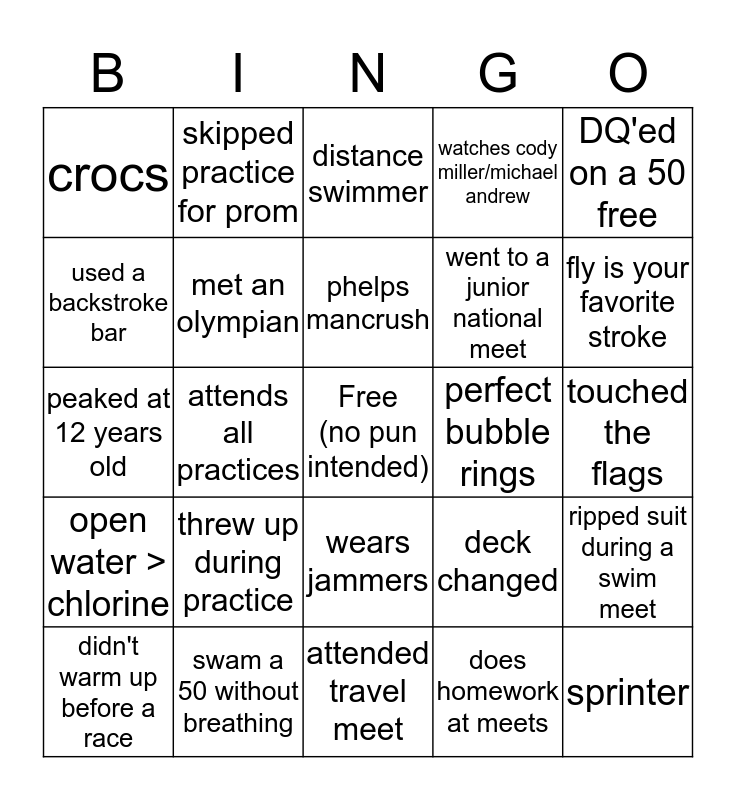 This bingo card has a free space and 24 words: threw up during practice, swam a 50 without breathing, phelps mancrush, didn't warm up before a race, DQ'ed on a 50 free, crocs, used a backstroke bar, skipped practice for prom, perfect bubble rings, wears jammers, went to a junior national meet, peaked at 12 years old, deck changed, ripped suit during a swim meet, met an olympian, does homework at meets, touched the flags, distance swimmer, fly is your favorite stroke, attends all practices, sprinter, open water > chlorine, watches cody miller/michael andrew and attended travel meet.